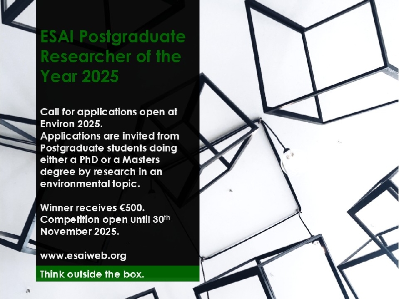 The winner will receive the prize of €500 and their certificate will be presented at the opening ceremony of Environ 2026. They will also be invited to give a guest lecture at the subsequent ESAI AGM which takes place at the ENVIRON 2026.