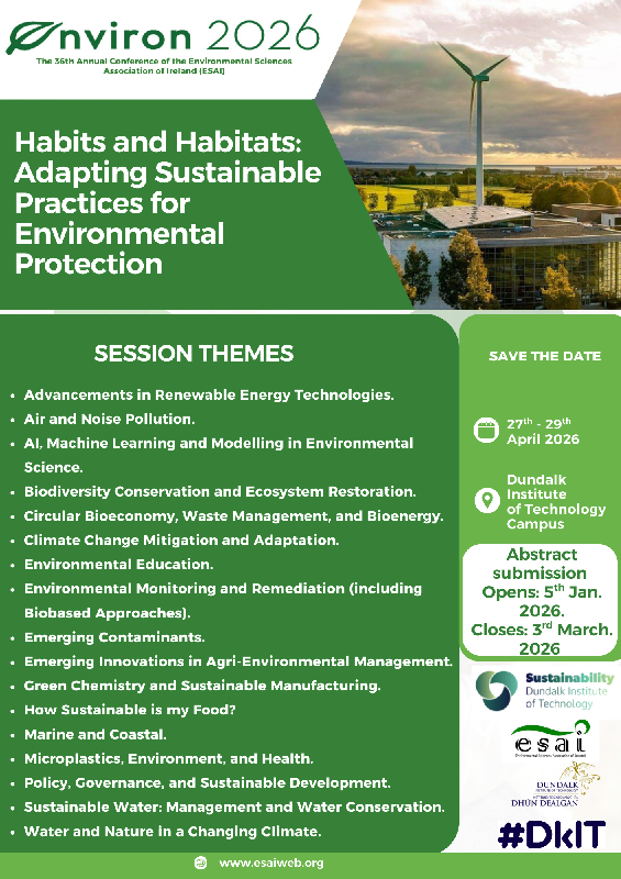 DkIT will host the 36th Irish Environmental Researchers Colloquium, Environ 2026, from 27 to 29 April 2026. The theme of Environ 2026, “Habits and Habitats: Adapting Sustainable Practices for Environmental Protection,” aligns well with DkIT’s work in sustainable water management, climate adaptation, biodiversity conservation, and nature-based solutions. Research on environmental education, governance, renewable energy, sustainable production, circular bioeconomy, agri-environmental management, and emerging contaminants highlight the role DKIT plays in developing practical solutions to environmental issues, with a clear focus on adoption and implementation. This year’s colloquium will feature an expanded and diverse range of session themes, designed to capture the breadth of contemporary environmental science. These sessions aim to foster interdisciplinary dialogue and provide a space for innovative research that addresses both the scientific and societal aspects of environmental protection. Please see conference poster here for a full list of session themes.